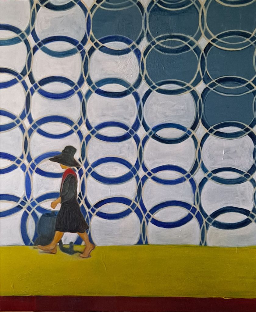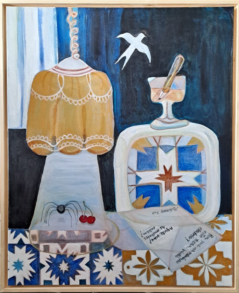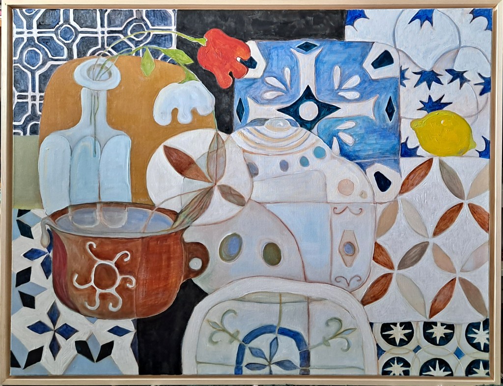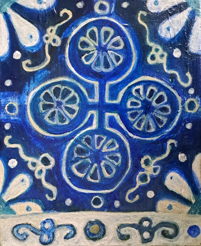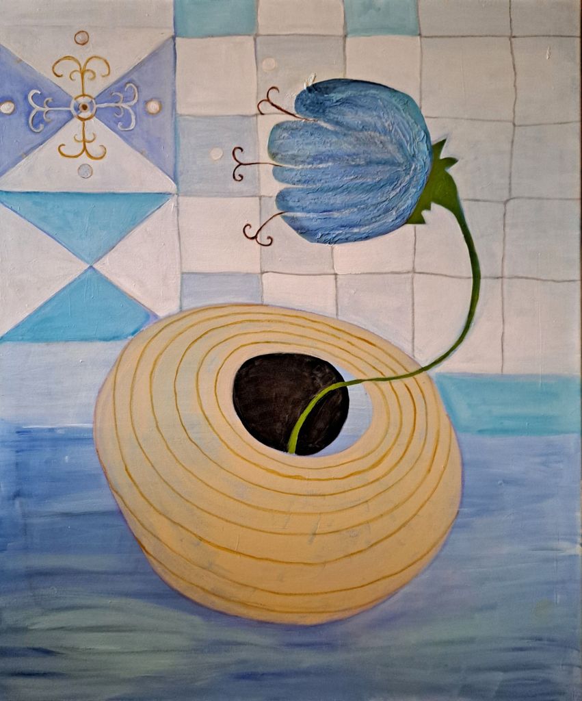 In the series Eternal Cobalt Fever Nyo makes a stylistic exception to her abstract expression. At the heart of the paintings are Azulejos tiles, which are found on buildings especially in the Iberian Peninsula, North Africa and Brazil. The aesthetics of azulejos are timeless, and at the same time their timelessness serves as a link between different eras: the colonial history of styles, trends, and colours is present.